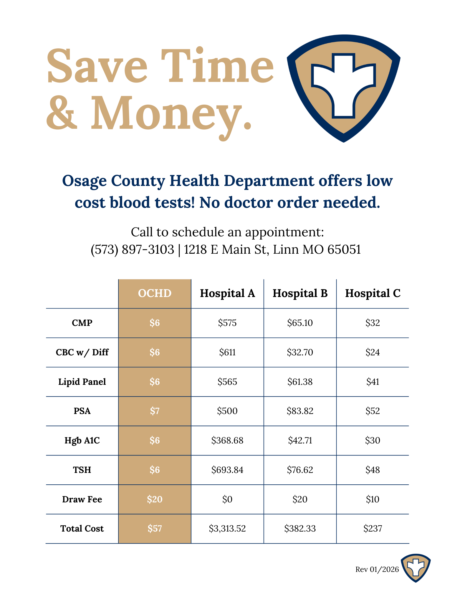 The Osage County Health Department can provide wellness labs without a doctor’s order. Any laboratory tests drawn without a physician’s order are self-pay. Health insurance cannot be billed for these services.